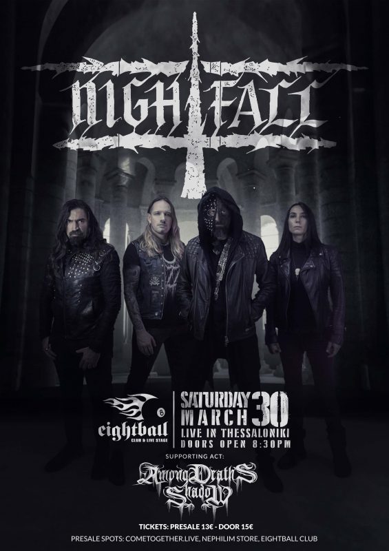 Μετά τη Λάρισα, οι NIGHTFALL θα εμφανιστούν ζωντανά στη Θεσσαλονίκη, το Σάββατο 30 Μαρτίου, στο Eightball Club με supporting act τους Among Death’s Shadow.
