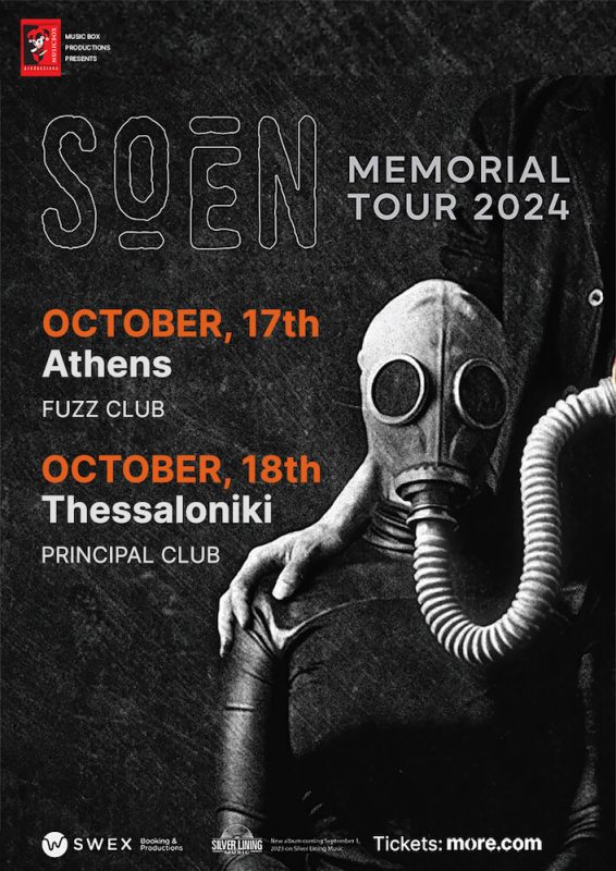 Οι Soen θα βρεθούν στο Fuzz Club στην Αθήνα, την Πέμπτη 17 Οκτωβρίου 2024 και στο Principal Club Theater στην Θεσσαλονίκη, την Παρασκευή 18 Οκτωβρίου 2024.