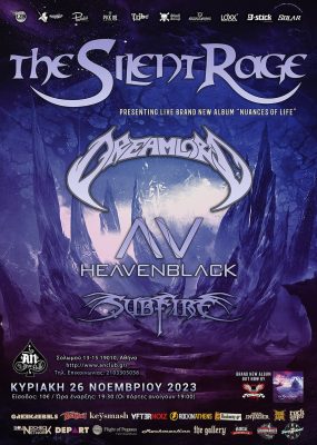 Έχοντας κυκλοφορήσει τον φετινό Μάιο τον δεύτερο ολοκληρωμένο δίσκο τους με τίτλο “Nuances Of Life”, μέσω της Ιταλικής ανεξάρτητης δισκογραφικής εταιρείας, Scarlet Records, οι THE SILENT RAGE αναμένεται να παρουσιάσουν για πρώτη φορά στο Αθηναϊκό κοινό υλικό μέσα από αυτό. Μαζί τους στην εμφάνιση τους αυτοί τους πλαισιώνουν οι heavy/thrash metallers DREAMLORD, οι modern heavy metallers HEAVENBLACK και τέλος οι power metallers SUBFIRE. Ετοιμαστείτε για μια βραδιά ποιοτικού heavy/power/thrash metal στα καλύτερα του!