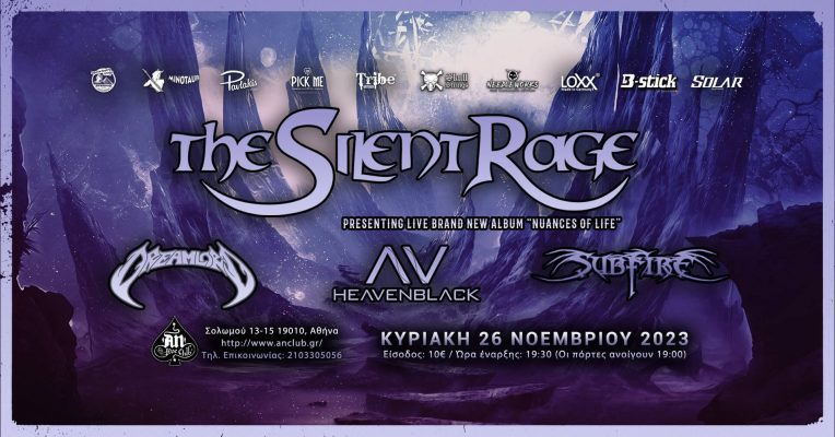 Έχοντας στην φαρέτρα τους τον νέο τους δίσκο, Nuances Of Life που μετράει μερικούς μήνες ζωής, οι THE SILENT RAGE παρουσιάζουν live την τελευταία τους δουλειά στο An Club στις 26 Νοεμβρίου. Μαζί τους οι DREAMLORD,HEAVEN BLACK και SUBFIRE. Αναλυτικά, το δελτίο τύπου:
