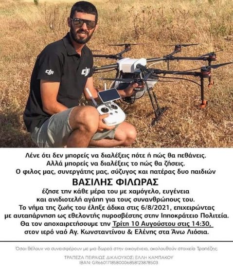 Αν θέλετε μπορείτε να δώσετε επιπλέον χρηματα.Τα έσοδα θα διατεθούν στην οικογένεια του Βασίλη Φιλώρα, πατέρα 2 παιδιών. Ο Βασίλης έχασε τη ζωή του ως εθελοντής στις πυρκαγιές.”