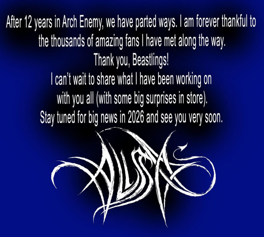Από τη μερία της η Alissa ανέβασε τη δική της ανακοίνωση χρησιμοποιώντας το λογότυπο του προσωπικού της project. “Μετά από 12 χρόνια στους Arch Enemy, οι δρόμοι μας χώρισαν. Είμαι για πάντα ευγνώμων στους χιλιάδες καταπληκτικούς οπαδούς που γνώρισα σε αυτή τη διαδρομή. Σας ευχαριστώ, Beastlings! Ανυπομονώ να μοιραστώ μαζί σας όλα όσα έχω ετοιμάσει (με μερικές μεγάλες εκπλήξεις). Μείνετε συντονισμένοι για τα μεγάλα νέα το 2026 και θα τα πούμε πολύ σύντομα.”