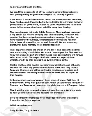 Εκείνη την εποχή, ο Erna είπε μόνο σε συνέντευξή της ότι ήταν «δύσκολο να απαντήσω αυτή τη στιγμή σε αυτό το στάδιο» και ότι «ο Tony και η Shannon έχουν κάποια προσωπικά πράγματα να κάνουν». Τώρα, όπως αποδεικνύεται, ο Larkin και ο Rombola αποχώρησαν και οι δύο από το συγκρότημα κάποια στιγμή το 2024.