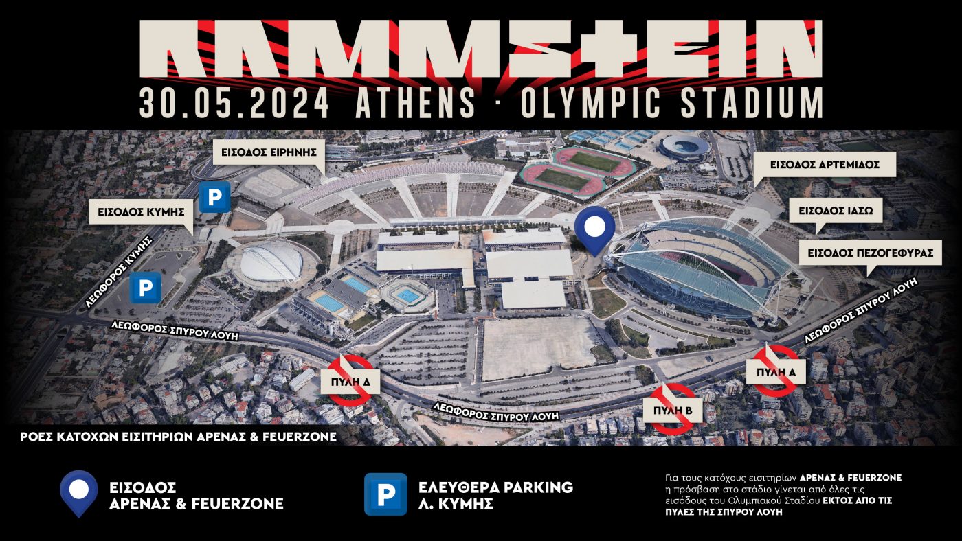ΕΚΤΟΣ από τις Πύλες της Λεωφόρου ΣΠΥΡΟΥ ΛΟΥΗ. Ακολουθώντας τη σήμανση οι κάτοχοι εισιτηρίων θα οδηγηθούν στην Είσοδο της Αρένας & Feuerzone (βλ. πινέζα του χάρτη)