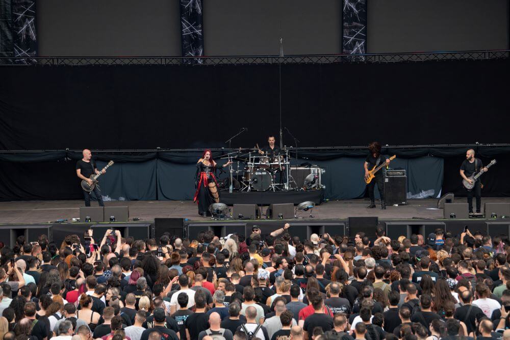 Τέλος οι headliners της ημέρας NIGHTWISH. Ανεβαίνουν στη σκηνή και στη θέα της Floor Jansen σε προχωρημένη εγκυμοσύνη είναι πραγματικά η ανατριχίλα και η συγκίνηση είναι ασυγκράτητη. Γλυκύτατη και επικοινωνιακή ακόμη και headbanging έκανε όσο της επέτρεπε η στρογγυλή κοιλίτσα της. Πολύ χαρούμενη που ήρθε στην Ελλάδα πρώτη φορά με τους NIGHTWISH ήταν αυτή που έδωσε μεγαλείο στην εμφάνιση της μπάντας. Όλοι οι υπόλοιποι καλοκουρδισμένοι και επαγγελματίες αλλά κάπως απόμακροι, απρόσωποι. Δεν έπαιξαν ιδιαίτερα με το κοινό. Εκτός από τη Floor λίγο ο Troy μίλησε αλλά γενικά το χαμόγελο της Floor ήταν που κέρδισε το κοινό. Ο ήχος τους μάλλον ο χειρότερος της βραδιάς. Έπαιζαν δυνατά σε σημείο παραμόρφωσης και δεν ακούγαμε τα προηχογραφημένα και το μόνο που υπερίσχυε ήταν το μπάσο. Μετά τη μέση ο ήχος λίγο έφτιαξε αλλά παρέμενε μπασαρισμένος και οι κιθάρες σχεδόν ανύπαρκτες. H Floor «κουβάλησε» όλη τη μπάντα μόνη της με πολύ σωστές ερμηνείες παρά την εγκυμοσύνη της. Το σετ λιστ ήταν κυρίως στα 3, 4 άλμπουμ πιο πρόσφατα άλμπουμ και φρόντισαν να μας τιμήσουν προβάλλοντας τον Παρθενώνα με το άγαλμα της Αθηνάς από πίσω τους. Μια πάρα πολύ καλή «τετράγωνη» και επαγγελματική εμφάνιση. Έπαιξαν πολύ καλά αλλά ήταν κάπως αποστειρωμένη η κατάσταση με εξαίρεση την Floor που τηρουμένων των αναλογιών της κατάστασής της ήταν πολύ καλή και είχε μια διάχυτη θετική ενέργεια.
